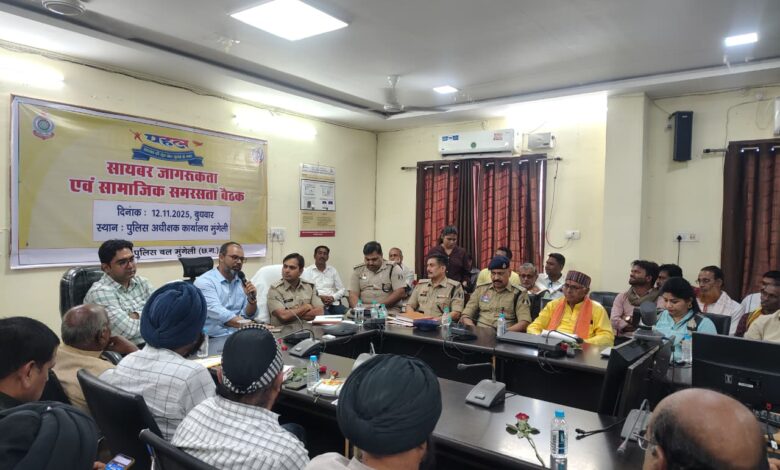 जिला कलेक्टर कुंदन कुमार (भा.प्र.से.) की उपस्थिति में पुलिस अधीक्षक भोजराम पटेल (भा.पु.से.) के मार्गदर्शन पर पुलिस विभाग द्वारा चलाये जा रहे अभियान “पहल ” के तहत संवाद सभा कक्ष पुलिस अधीक्षक कार्यालय मुंगेली में सामाजिक समरसता बनाये रखने हेतु सामाजिक जागरूकता बैठक का आयोजन किया गया। बैठक में साइबर अपराध, यातायात नियम के पालन, नशामुक्ति एवं बच्चों व महिलाओं से संबंधित अपराधों के संबंध में जानकारी देते हुये सामाजिक स्तर पर सामाजिक बुराईयां एवं कुरितियां साइबर फ्रॉड के प्रलोभन में नहीं आने, नशा से दूर रहने तथा यातायात नियमों का पालन करने व कम उम्र के बच्चों को वाहन चलाने पर प्रतिबंधित करने के संबंध में बातें बतायी। बैठक में जिले के 150 से अधिक समाज प्रमुख एवं सामाजिक प्रतिनिधिगण उपस्थित रहे।