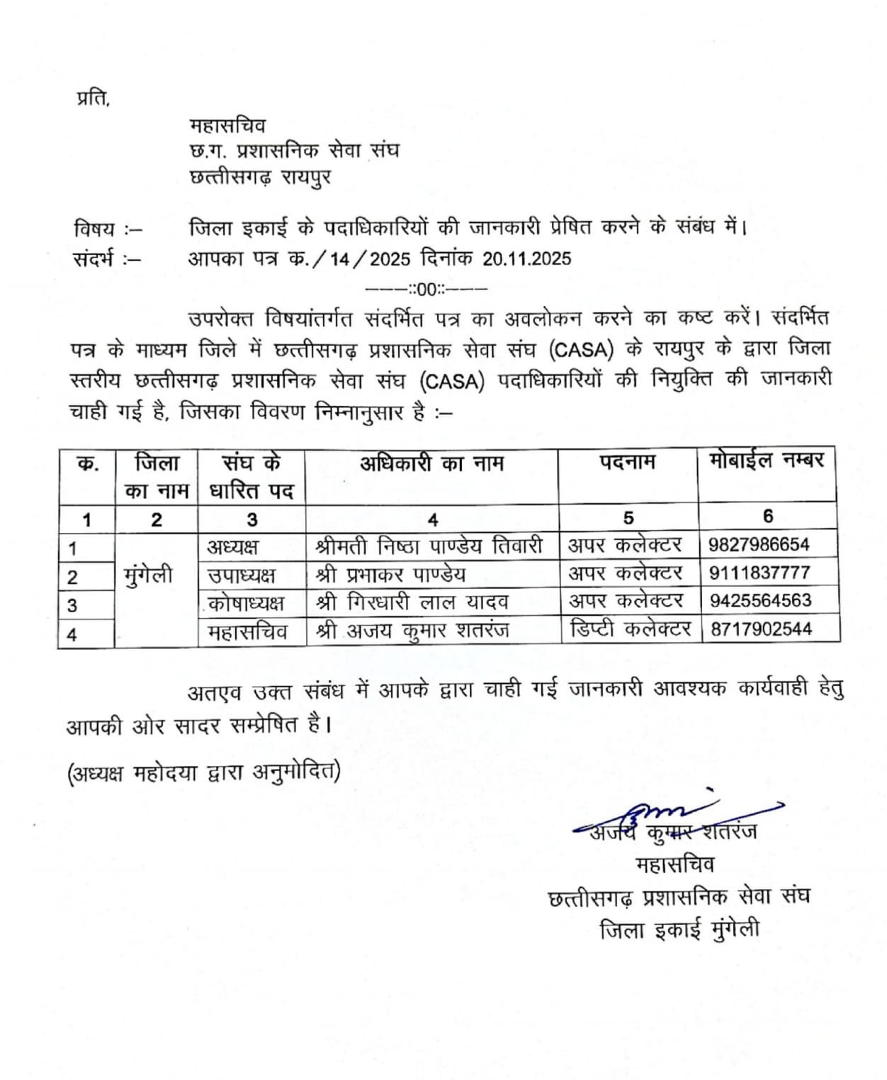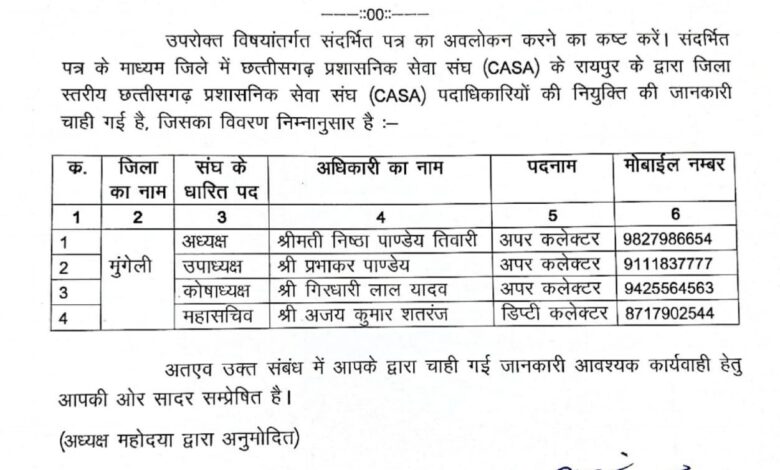 छत्तीसगढ़ प्रशासनिक सेवा संघ (CASA) की जिला इकाई मुंगेली के पदाधिकारियों की आधिकारिक सूची जारी की गई है। रायपुर स्थित प्रदेश स्तरीय संघ द्वारा भेजे गए पत्र के क्रम में जिला कार्यालय ने पदाधिकारियों का विवरण सार्वजनिक किया है। जारी आदेश के अनुसार मुंगेली जिले के लिए निम्न पदाधिकारियों की घोषणा की गई है—