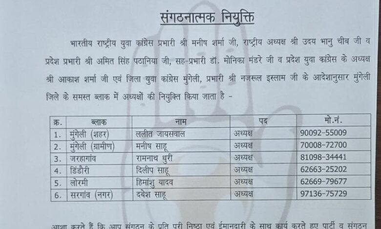जारी आदेश के अनुसार मुंगेली जिले के छह ब्लॉकों में नए युवा कांग्रेस अध्यक्षों की नियुक्ति की गई है। सूची के अनुसार—
