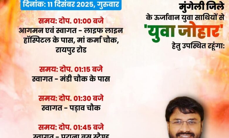 जिला मुंगेली के ऊर्जावान युवा साथियों से “युवा जोहार” हेतु भाजयुमो के प्रदेश अध्यक्ष राहुल योगराज ठिकरिहा जी कल दिनांक: 11दिसंबर 2025, गुरुवार , समय दोप. 01:00 बजे आगमन एवं जिनका स्वागत – लाइफ लाइन हॉस्पिटल के पास, मां कर्मा चौक, रायपुर रोड ,समयः दोप. 01:15 बजे स्वागत- मंडी चौक के पास, समयः दोप. 01:30 बजे स्वागत – पड़ाव चौक के पास, समयः दोप. 01:45 बजे स्वागत – पुराना बस स्टैण्ड के पास, समयः दोप. 02:00 बजे स्वागत कार्यक्रम एवं उद्बोधन – भाजपा कायर्यालय, अटल परिसर, मुंगेली में उपस्थित रहेंगे।
