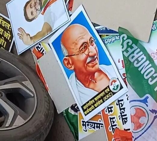 भाजपा कार्यालय घेराव के बाद मुंगेली कांग्रेस कमेटी ने राष्ट्र पिता महात्मा गाँधी का फोटो को सड़क किनारे फेंक कर अपमान किया साथ ही अपने राष्ट्रीय अध्यक्ष राहुल गाँधी के फोटो को भी सड़क किनारे फेंक कर चलते बने। नेशनल हेराल्ड मामले में न्यायालय द्वारा दिए गए फैसले के बाद केंद्र और राज्य की भाजपा सरकार पर तीखा हमला करते हुए कांग्रेस ने पूरे प्रदेश में विरोध प्रदर्शन तेज कर दिया है। इसी क्रम में प्रदेश कांग्रेस अध्यक्ष दीपक बैज के निर्देश पर छत्तीसगढ़ के सभी जिलों में भाजपा कार्यालयों का घेराव किया जा रहा था घेराव के बाद भाजपा कार्यालय के सामने कांग्रेसी कार्यकर्ताओ ने तखती में अपने राष्ट्रीय नेता राहुल गाँधी और राष्ट्र पिता महात्मा गाँधी की फोटो और पार्टी की झंडा, भाजपा विरोधी नारों के साथ – साथ भाजपा सरकार और जिला प्रशासन के खिलाफ स्लोगन लिए तखती को रोड किनारे सड़क में फेंक कर चले गए थे,