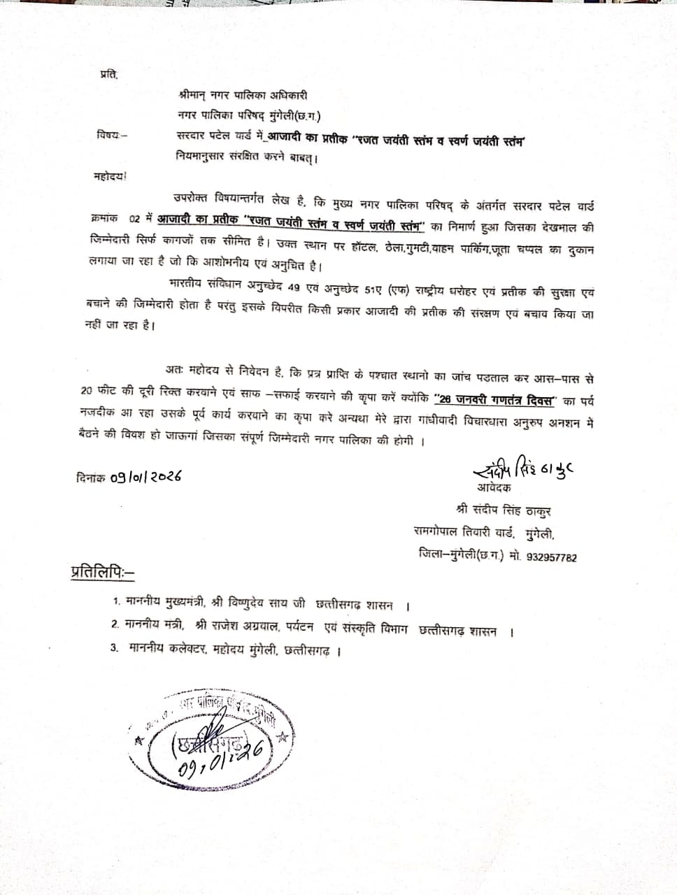 आजादी के प्रतीक “रजत जयंती स्तंभ एवं स्वर्ण जयंती स्तंभ” नगर पालिका परिषद मुंगेली के अंतर्गत सरदार पटेल वार्ड क्रमांक 02 में स्थित, इन दिनों बदहाली और अतिक्रमण के शिकार बने हुए हैं। इस गंभीर विषय को लेकर रामगोपाल तिवारी वार्ड निवासी एवं सामाजिक कार्यकर्ता संदीप सिंह ठाकुर ने मुख्य नगर पालिका अधिकारी को लिखित ज्ञापन सौंपते हुए तत्काल संरक्षण की मांग की है।