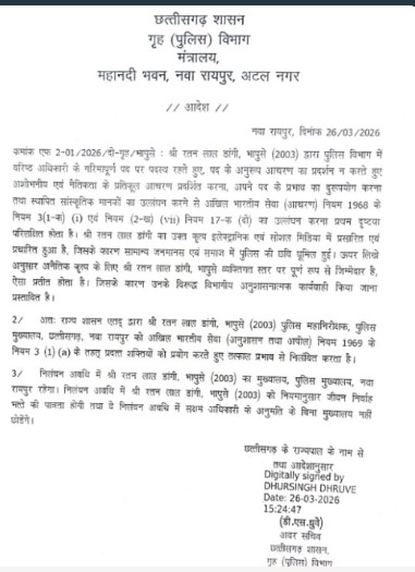 राज्य सरकार ने भारतीय पुलिस सेवा (IPS) के वरिष्ठ अधिकारी रतन लाल डांगी को तत्काल प्रभाव से निलंबित कर दिया है। यह कार्यवाही उन पर सोशल मीडिया में महिला के साथ कथित आपत्तिजनक फोटो, अश्लील चैट वायरल होने के मामले में राज्य सरकार ने की है। आदेश में कहा गया है कि अधिकारी ने अपने पद के अनुरूप आचरण नहीं किया और गरिमापूर्ण पद पर रहते हुए नैतिकता के प्रतिकूल व्यवहार किया।