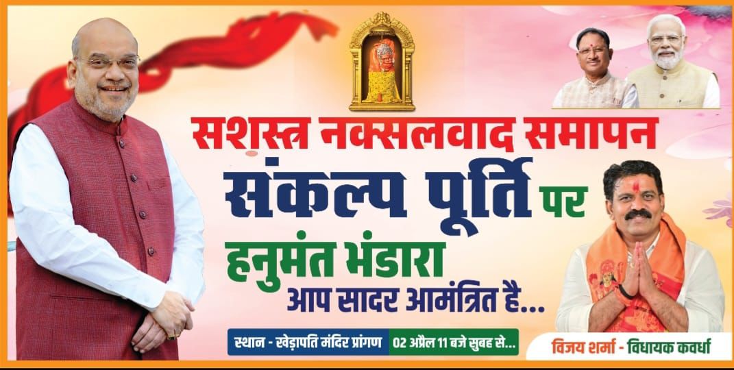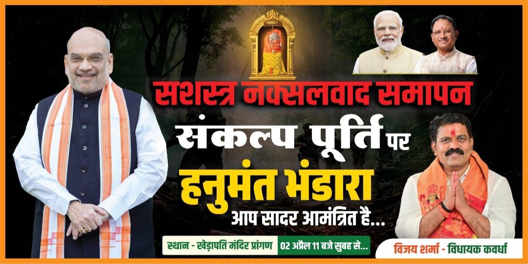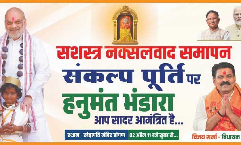 31 मार्च 2026 की नियत तिथि तक बस्तर सहित छत्तीसगढ़ से सशस्त्र नक्सलवाद के पूर्णतः समाप्त होने की ऐतिहासिक उपलब्धि के उपलक्ष्य में 2 अप्रैल को कवर्धा स्थित खेड़ापति हनुमान जी महराज मंदिर में पावन हनुमंत भंडारा का आयोजन किया जा रहा है। इस पावन आयोजन के माध्यम से प्रदेश में स्थापित शांति, सुरक्षा और समृद्धि के नए युग का अभिनन्दन करते ईश्वर का आभार नमन-वंदन किया जाएगा।