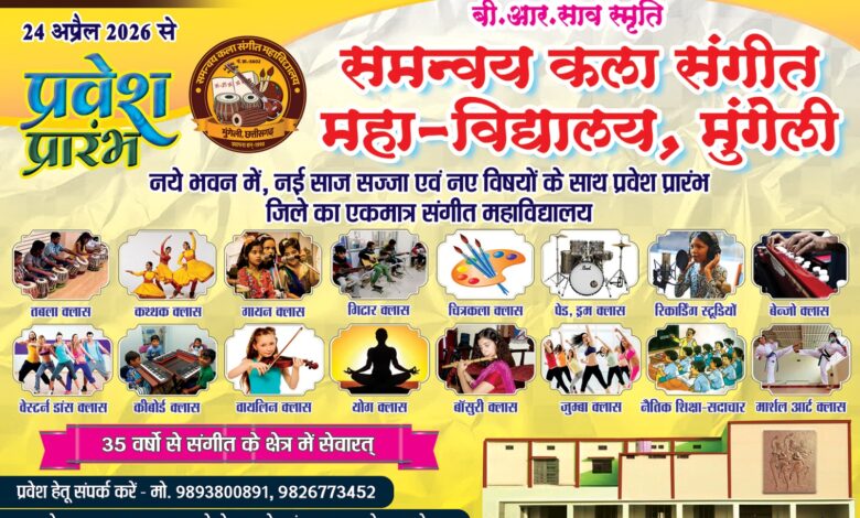 जिले के कला एवं संगीत प्रेमियों के लिए खुशखबरी है। बी.आर. साव स्मृति समन्वय कला संगीत महाविद्यालय, मुंगेली में नवीन सत्र हेतु प्रवेश प्रक्रिया 24 अप्रैल 2026 से प्रारंभ की जा रही है। यह संस्थान अखिल भारतीय गांधर्व महाविद्यालय मंडल, मिरज (महाराष्ट्र) से मान्यता प्राप्त है तथा पिछले 35 वर्षों से संगीत एवं कला शिक्षा के क्षेत्र में सेवाएं दे रहा है।