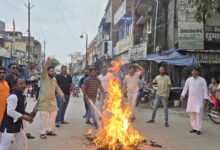 मुंगेली युवामोर्चा ने राहुल गांधी व तेजस्वी यादव का परशुराम चौक में मंच से गाली देने के विरोध में पुतला दहन किया